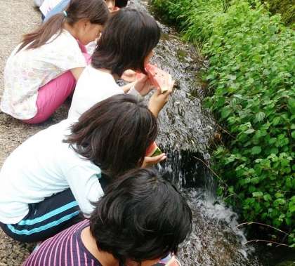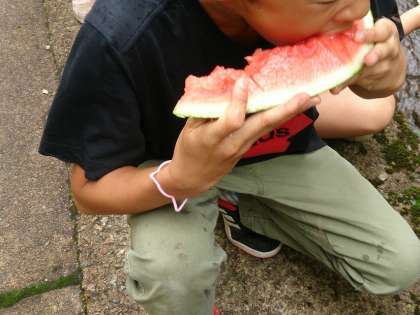 野外炊飯で昼食をとった後、野外遊びをして下山しました。宿舎の前で、おやつのスイカをみんなで食べました。