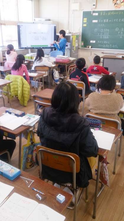 4年生の算数で、「筆算の説明の仕方を考えよう」という課題について学習しています。既習の学習を活用しながら、発表していきます。