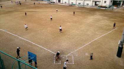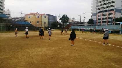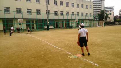 6年生の体育で、ソフトボールのゲームに取り組んでいます。チームで声を掛け合いゲームを楽しんでいます。
