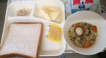 今日の給食は、八宝菜、もやしのごま酢あえ、りんご、アプリコットジャム、パン、牛乳です。