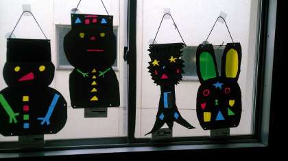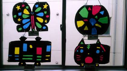 2年生の図工で、以前から取り組んでいた、作品「ひかりのプレゼント」が完成しました。いろいろな色のセロファンを貼って、太陽の光でステンドグラスのように光る作品です。