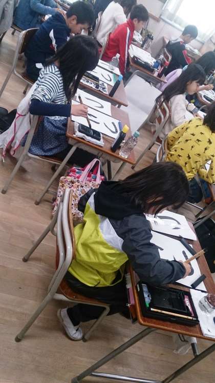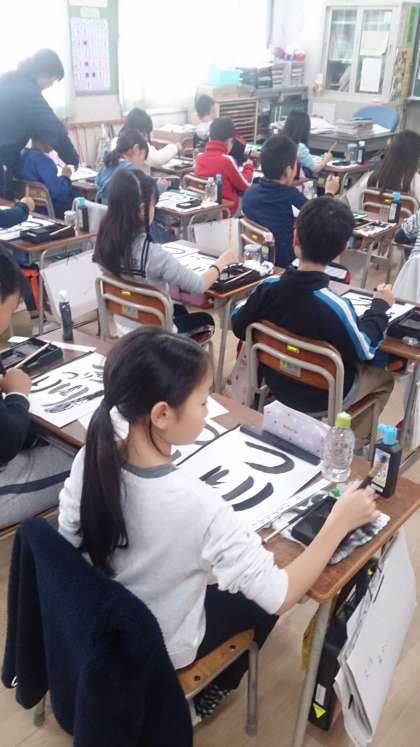 3年生の国語の書写で、「つり」の字を書いています。お手本を見て、「曲がり」と「はらい」の筆遣いを注意して書いています。