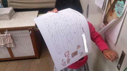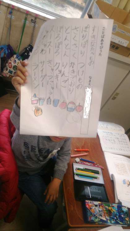1年生の国語では、「ことばあそび」の作文に取り組んでいます。好きな食べ物や動物に、擬音語・擬態語などをつけて、リズミカルな文を作っています。