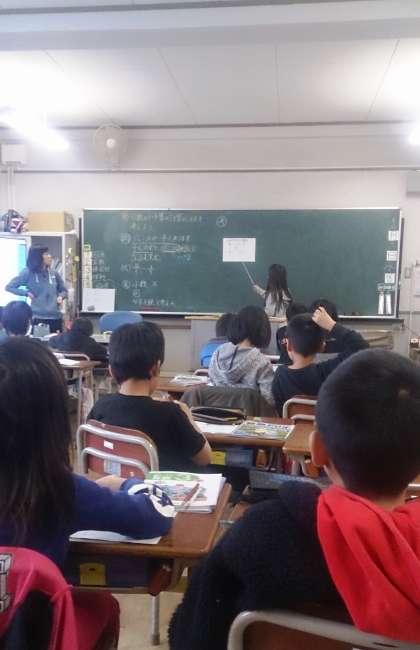 3年生の算数では、分数の引き算について学んでいます。友だちの発表をしっかり聞いて、話し合っています。