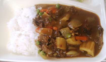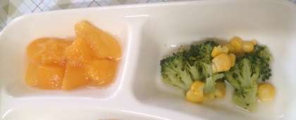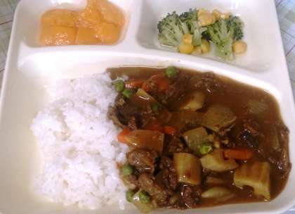 今日の給食は、冬野菜のカレーライス、ブロッコリーとコーンのサラダ、黄桃、牛乳です。