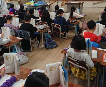 「おとうとねずみ チロ」をみんなで音読しています。みんなそろって、元気な声で読めました。