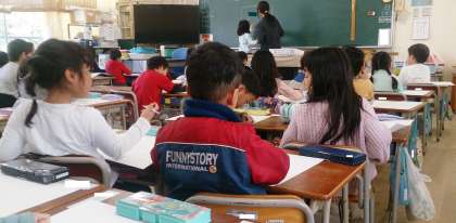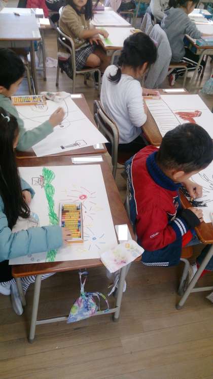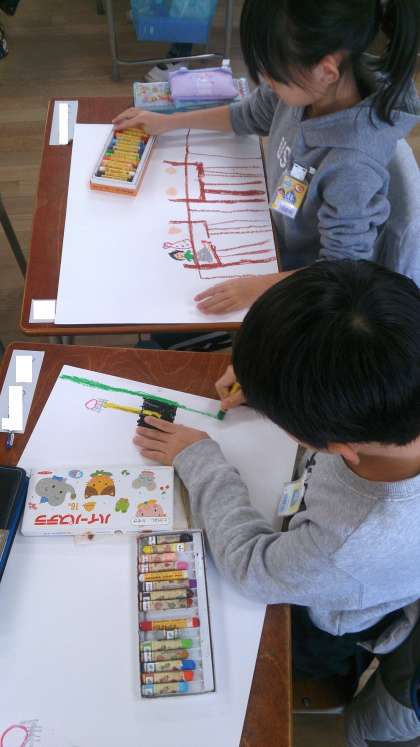 1年生の図画工作で、描画に取り組んでいます。題材は、「せんせいあのね」で、楽しかったことや好きなことなど、絵に表現したいことを見つけて描画します。