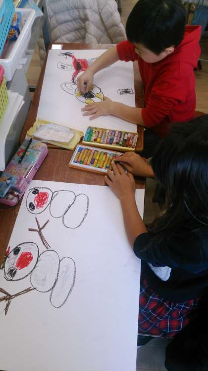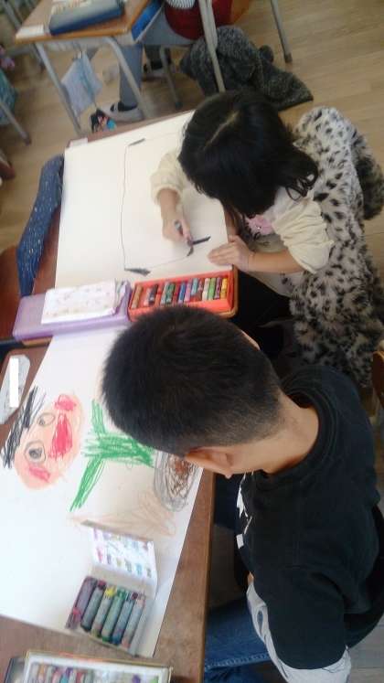 子どもたちは、工夫して絵に表して話したいことを見つけて描画しています。にこにこしながら、取り組んでいる子もいます。