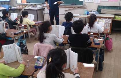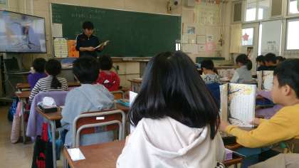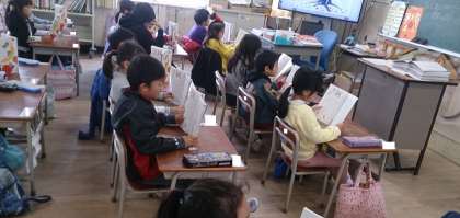 1年生の国語で、物語文「おとうとねずみチロ」の学習に取り組んでいます。一斉音読で、場面を読み取っています。