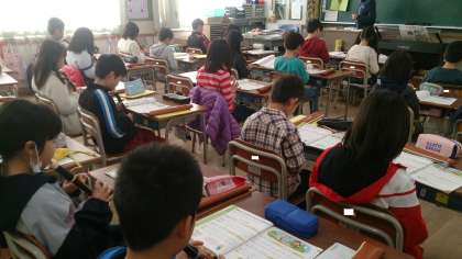 3年生の音楽で、リコーダーの演奏に取り組んでいます。演奏曲は、「ゆかいな木きん」です。