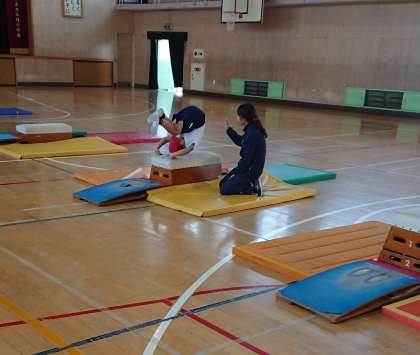 みんなで協力して跳び箱やマットの準備をしました。気をつけるべき点をみんなで確認してから、台上前転に挑戦しました。