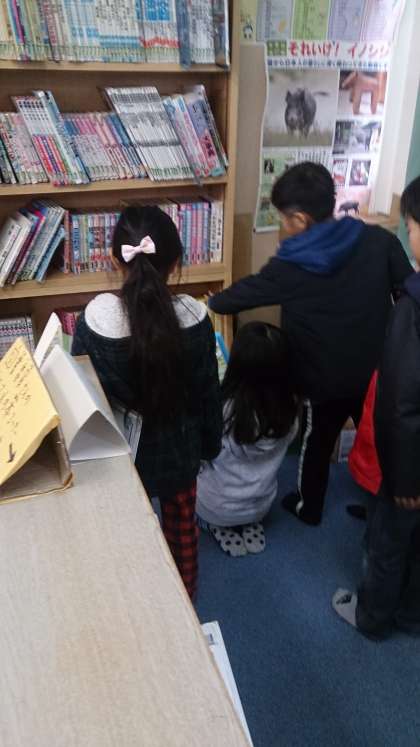 2年生の国語の図書で、読書活動に取り組んでいます。子どもたちは熱心に自分の読みたい本を選んでいます。冬休みにも、たくさんの本を読んでほしいと思います。