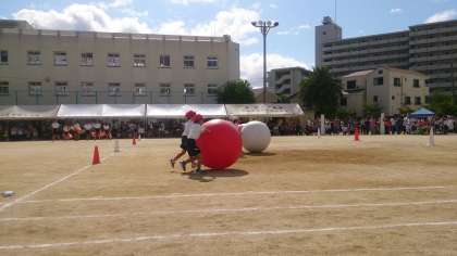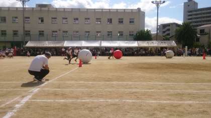 2年生「大玉コロコロ」友だちと力を合わせて、押しています。