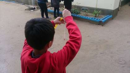 4年生の理科で、タブレットや温度計なとを活用し、冬の植物の様子を観察しています。植物の成長の変化と季節の気温の変化を比較して予想や仮説をもてるように学習しています。