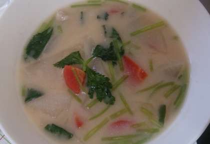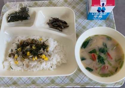 今日の給食は、れんこんのちらし寿司、ぞうに、ごまめです。