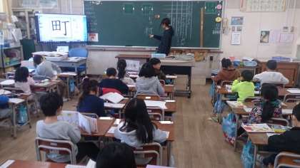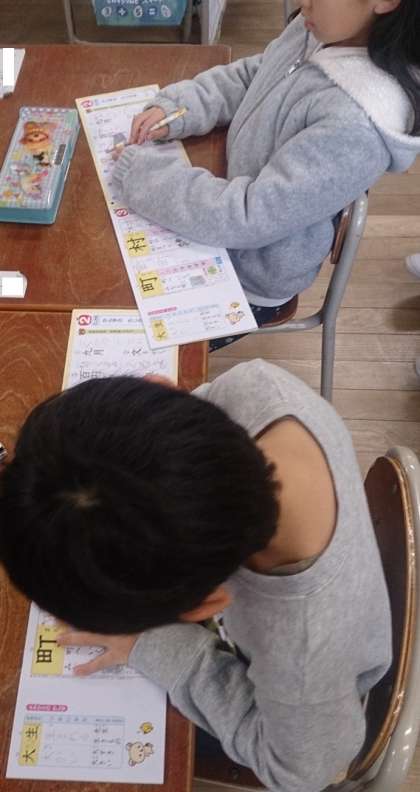 1年生の国語で、「村」や「町」などの新出漢字の学習に取り組んでいます。子どもたちは、丁寧にドリルで練習しています。