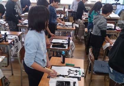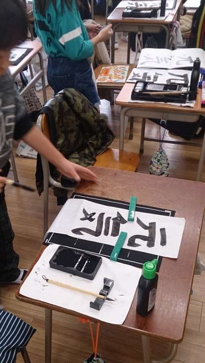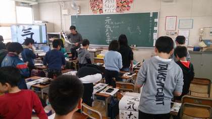 4年生の国語・書写で、書き初め「元気な子」の毛筆に取り組んでいます。文字の大きさやバランスに気を付けて書いています。