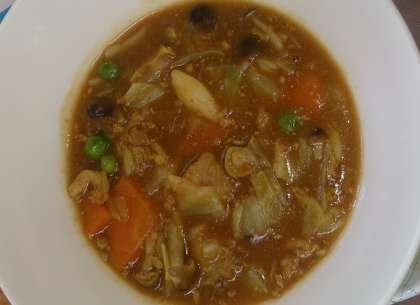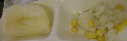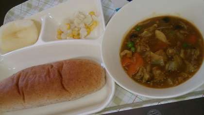 今日の給食は、豚肉と野菜のカレー煮、カリフラワーとコーンサラダ、りんご、パン、牛乳です。