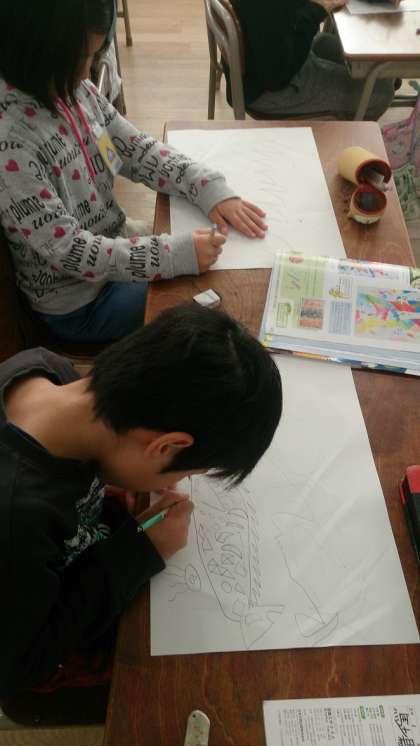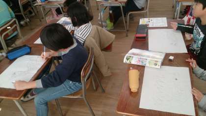 3年生の図工で、「海のぼうけん」という紙版画に取り組んでいます。自分の好きな動物を紙版画で表現する学習です。最初は、下絵を描いていきます。