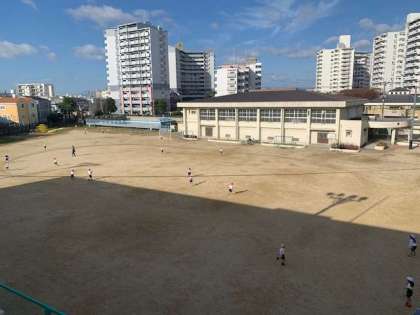 鬼ごっこによる体ほぐしをしています。広い運動場を活かして駆け回っています。