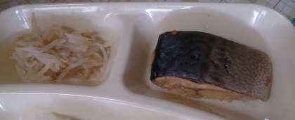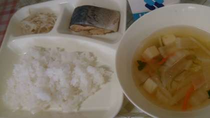 今日の給食は、さばのみそ煮、すまし汁、もやしのゆずの香あえ、ごはん、牛乳です。