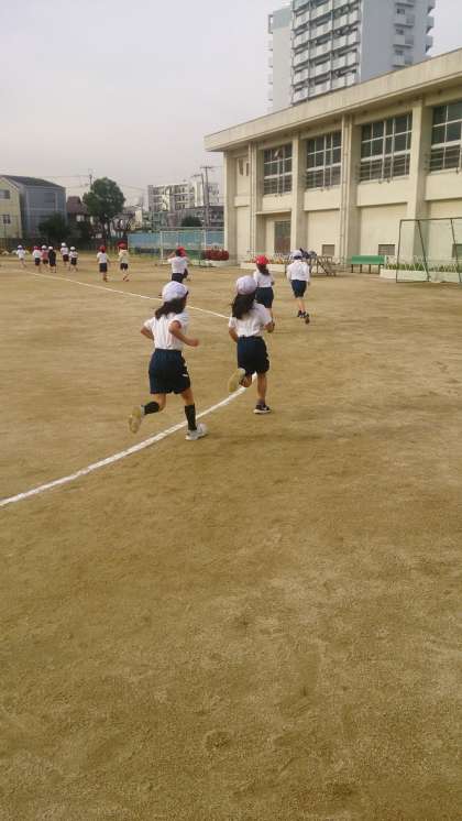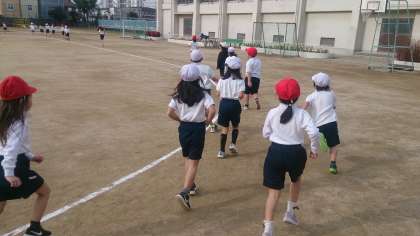 1年生の体育で、かけ足の運動に取り組んでいます。無理のない速さで走ることが大切です。