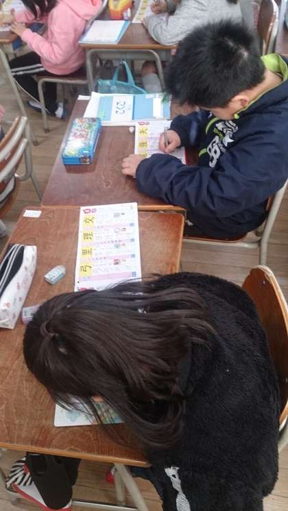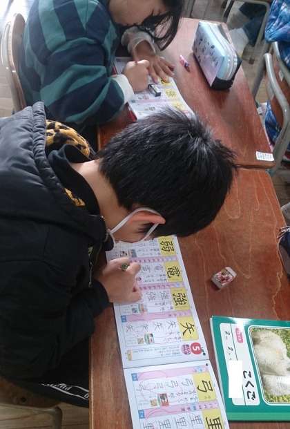 2年生は、国語で漢字の学習に取り組んでいます。「電」や「強」など、一画一画丁寧に書いています。