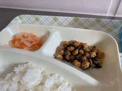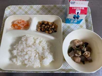 今日の給食は、筑前煮、ひじき豆、紅白なます、ご飯、牛乳です。