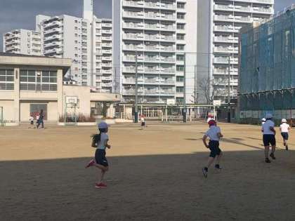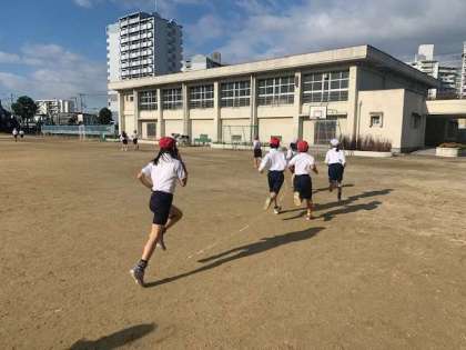 体つくりの学習で、長距離走を行っています。走る時間と歩く時間を交互にとり、インターバルトレーニングにも取り組んでいます。
