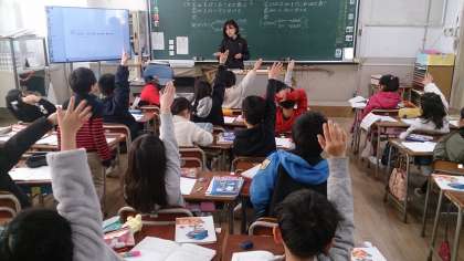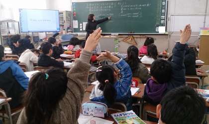 2年生の算数で、100より大きい数について学習しています。同じ大きさの集まりにまとめて数えたり、分類して数えたりする学習内容です。子どもたちは、積極的に発表しています。