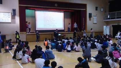 クイズの給食調理員さんのインタビューでは、安全でおいしく給食をつくっていることなどが紹介されました。その後、給食委員会の子どもたちの歌とダンス。そして、最後に、子どもたちから、給食調理員さんたちへ感謝の言葉を伝えました。