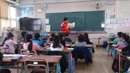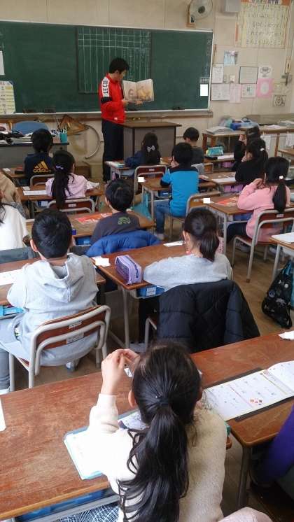 1年生の国語の学習で、物語文の読み聞かせをしています。子どもたちは、とても真剣に先生の読む物語を聞いています。
