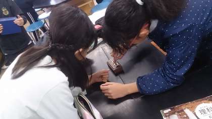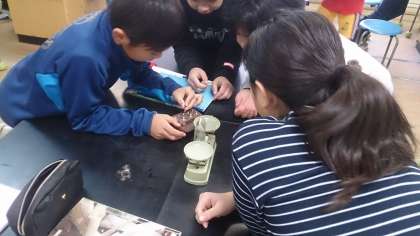 5年生の理科で、水にものを溶かすと重さがどうなるのかという課題に取り組んでいます。てんびんを使って実験しています。