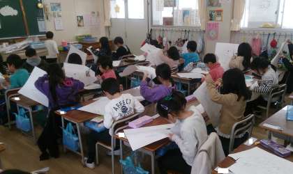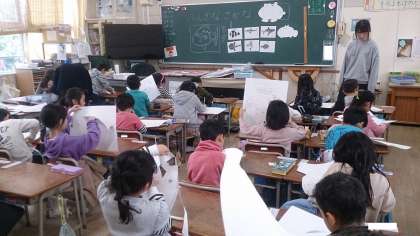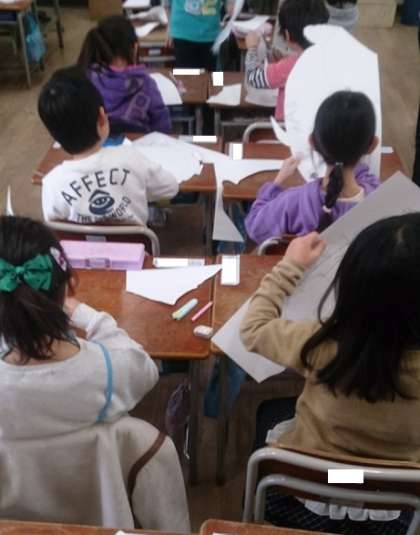 1年生の図画工作で、魚を題材に描画に取り組んでいます。書いた後に形にそってはさみで切り、その後、色をつけていきます。
