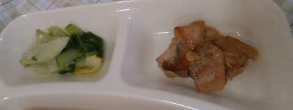 今日の給食は、鶏肉のオイスターソース焼き、えびととうふのスープ、チンゲンサイのピリ辛あえ、パン、牛乳です。