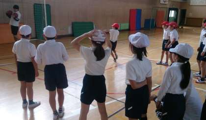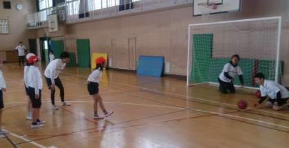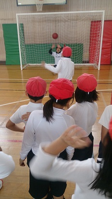 3年生が、大阪経済大学のフットサル部の学生の方たちに、フットサルを教えてもらいました。最初は、シュート練習です。子どもたちは、笑顔で取り組んでいます。