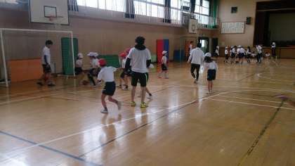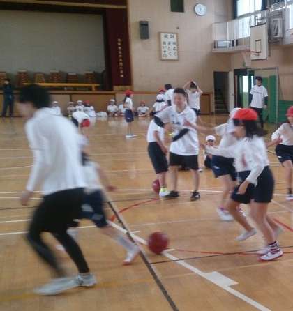 練習の後、みんなで、フットサルのゲームをしました。子どもたちは、必死にボールを追いかけています。最後に、学生の方たちにお礼の挨拶をしました。子どもたちにとって、とても楽しい時間となりました。
