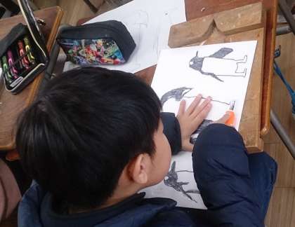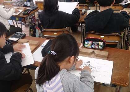 4年生の図画工作で、動物を題材に木版画づくりに取り組んでいます。彫刻刀の使い方にも少しずつ慣れて、スムーズに彫れるようになってきました。