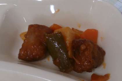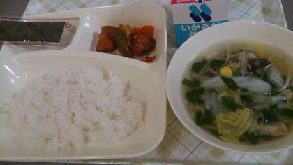 今日の給食は、酢豚、中華スープ、焼きのり、ごはん、牛乳です。