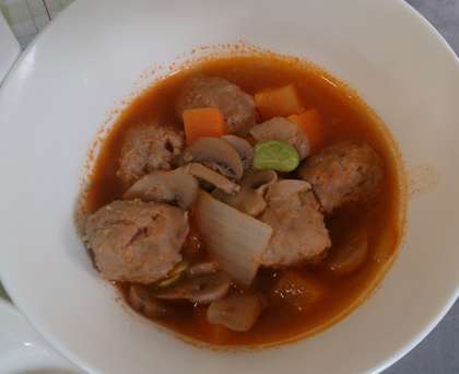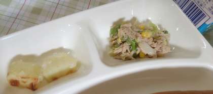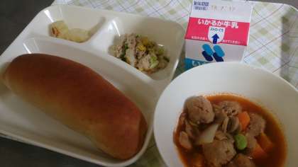 今日の給食は、ミートボールのケチャップ煮、ツナと野菜のソテー、焼きじゃが、パン、牛乳です。