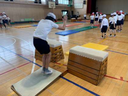 跳び箱運動に取り組んでいます。各場所を回りながら、かかえこみ跳びの習得に励んでいます。