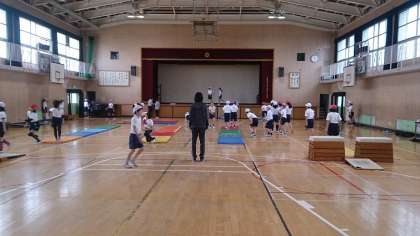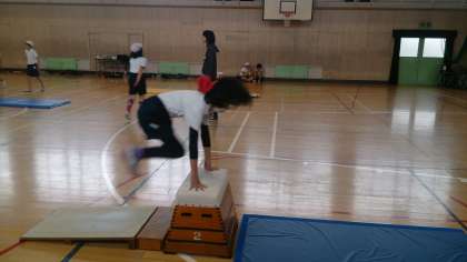 子どもたちは、自分のめあてをもって、跳び箱運動に取り組んでいます。自分なりに工夫しながら、かかえこみ跳びを練習しています。