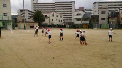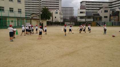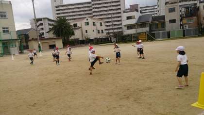 2年生の体育で、ボールけりゲームの運動に取り組んでいます。シュートが入るとチームで大喜びしています。運動場に、子どもたちの元気な声が響いています。