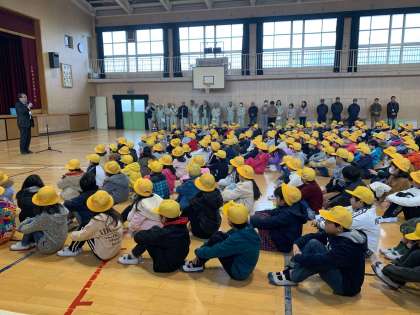 3階避難の後は講堂に集まり、本日講師としてお世話になる、東淀川消防署、東淀川区役所、区社会福祉協議会、北部包括支援センター、井高野連合地域防災リーダーの皆さんとあいさつを行いました。校長先生、また区役所の担当の方から、本日の防災学習を取り組む上で大事なこと、「自助」「共助」についてのお話を聞きました。