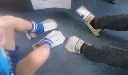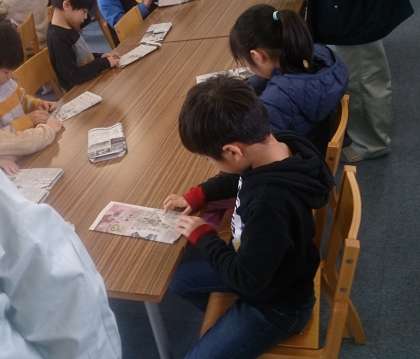 下の写真は、完成したスリッパをはいている子どもたちです。
