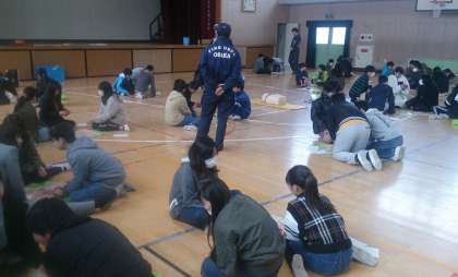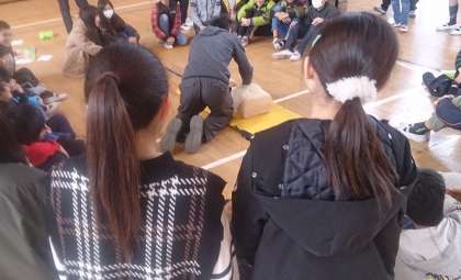 6年生の防災学習では、消防署の方から救命講習を受けました。心肺蘇生のやり方など、丁寧に教えていただきました。先生もお手本を見せました。子どもたちも真剣に取り組んでいました。
