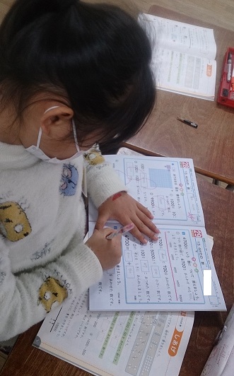 2年生の算数で、単元の学習の仕上げに取り組んでいます。4ケタの数について、教科書やドリルを使ってまとめています。