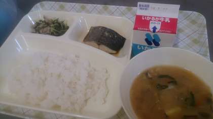 今日の給食は、さごしのしゅうゆだれかけ、みそ汁、みずなの煮びたし、ごはん、牛乳です。