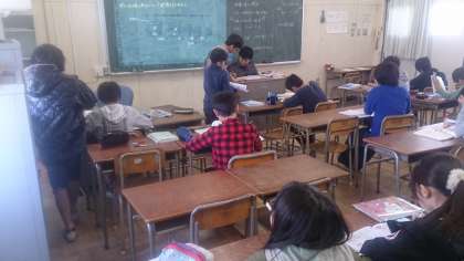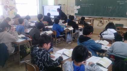 6年生の算数で、学年を3分割して学習に取り組んでいます。今日は、体積の単位と仕組みについて学んでいます。
