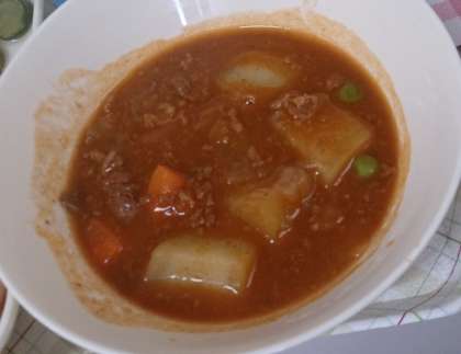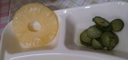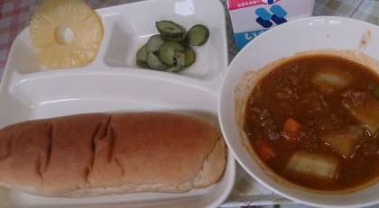 今日の給食は、ビーフシチュー、きゅうりのバジル風味サラダ、パインアップル、パン、牛乳です。
